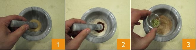 To prepare the oven beer can chicken, start by preparing the Beef Broth, then proceed to make the rub. Place the brown sugar 1 in a mortar and begin to grind it with the pestle. Once you have a fine powder, add the paprika 2 and grind again. Add the oregano and grind 3.