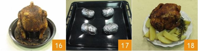 Place the chicken in the holder 13 and bake in a preheated static oven at 383°F for about 45/50 minutes. A quick side dish can be made with baked potatoes. Wash the potatoes well, and without removing the skin, wrap them in aluminum foil (14-15), then place them on a second tray to be placed on the lowest rack of the oven. Cook together with the chicken for the same time and at the same temperature.