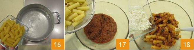Cook the rigatoni al dente in plenty of salted water 16 for 7-8 minutes. In a bowl, pour the ragù, the drained al dente rigatoni 17, the grated salted ricotta 18 and mix.