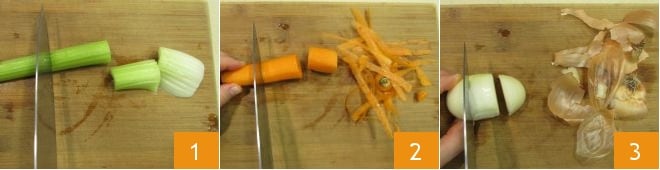 To prepare the beer macaroni timbale with ragù and eggplants, first wash and trim the celery, do the same for the carrot and onion, then cut them into coarse pieces (1-2-3)