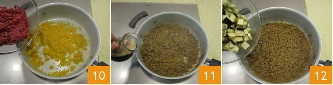 Add the ground meat 10 and let it absorb the flavors for about ten minutes, stirring often. Then deglaze with the beer 11 and as soon as the alcohol has evaporated, you can add the eggplant cubes 12. Adjust with salt and pepper and let it cook again on low heat for 15 minutes.