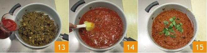 At this point, add the tomato puree 13 and continue cooking for another 30-40 minutes 14: let the sauce dry completely otherwise it may make the mixture too soft during cooking. At the end of cooking, perfume with basil 15.
