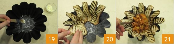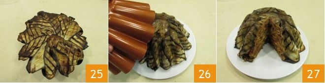 up to the edge 22; you will need to distribute the mixture well around, especially in the mold's hollows, and once you reach the top, press well to then fold the ends of the eggplant slices inward and cover with the remaining grilled eggplant slices 23: lay these last slightly overlapping like forming a spiral and brush them with olive oil 24.