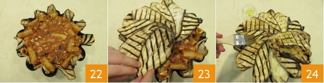 Take a 1.5-liter pudding mold and butter it 19; start lining it with the grilled eggplant slices, following the mold's grooves; place them slightly overlapping lengthwise, making sure one end of each slice slightly exceeds the mold's edge 20. Stuff with the rigatoni 21