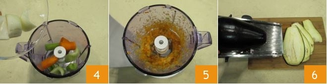 and place them in a blender 4, blend for a few moments to finely chop the ingredients 5. Grate the salted ricotta and set aside; then wash and trim one of the eggplants: using a mandoline, slice it thinly lengthwise 6, you will need to obtain 25 slices about 1/8 inch thick, this way you'll be sure to completely line the mold.