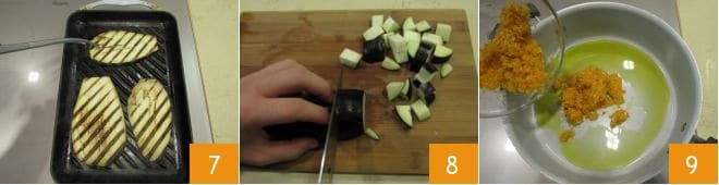 Grill the eggplant slices for a few minutes on a hot grill, on both sides 7. Then take the other eggplant, remove the ends, and cut it into cubes 8. In a saucepan, heat the olive oil, add the aromatic vegetable mince 9 and let it sauté for 10 minutes on low heat, stirring occasionally. If it seems to dry too quickly, add a bit of water.