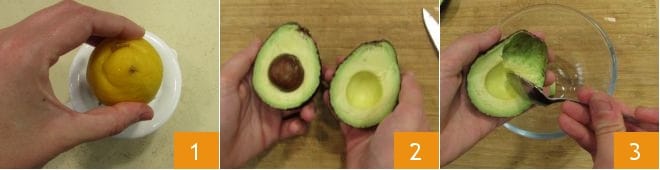 To prepare the beetroot and avocado tartare, first squeeze the juice of half a lemon 1 and set it aside. Cut the avocados in half 2, remove the pit, and then scoop out the flesh with a spoon into a bowl 3.