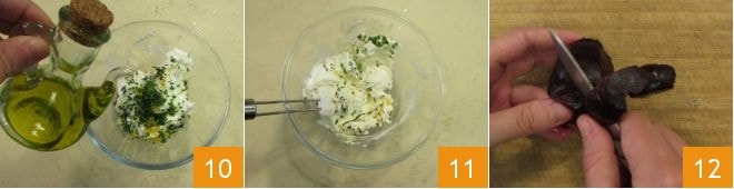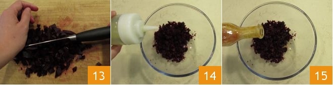 Drizzle with a dash of oil 10 and mix well to add flavor 11, cover with plastic wrap, and place in the fridge to firm up. Peel the beetroot 12 (we used pre-cooked ones)