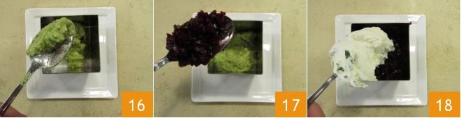 Place a 2.4 x 2.4 inches square ring on a plate (the dimensions can vary according to your needs), pour a first layer of avocado 16, press and level with the back of a spoon. Proceed with a layer of beetroot tartare 17 and finish with a layer of spreadable cheese cream 18.