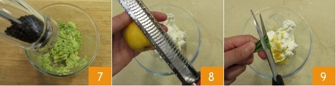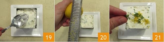 add salt and pepper 7. Cover with plastic wrap and set aside in the refrigerator. In a bowl, place the fresh spreadable cheese, the zest of an untreated lemon 8, salt, pepper, thyme leaves, and chives cut with scissors 9.