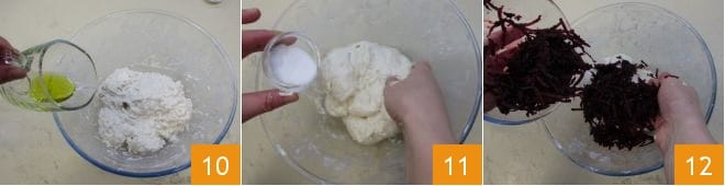 Then add the olive oil 10 and finally the salt 11. Mix the ingredients well and then incorporate the grated beetroot 12.