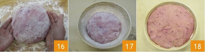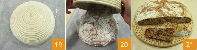 The final rise will take about 1 and a half hours. After this time, flip the bread onto a baking sheet lined with parchment paper (19-20) and bake in a preheated oven at 430°F for 40 minutes, making sure to place a small bowl of water in the oven for the first 40 minutes of baking. Then, after this time, remove the bowl of water and continue baking for another 20 minutes. Once baked, take out your beetroot bread and let it cool before serving 21!