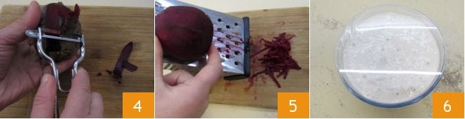 In the meantime, prepare the beetroots: peel them 4 and grate them using a grater with large holes 5. After the rising time, retrieve the poolish, which will have doubled in size 6.