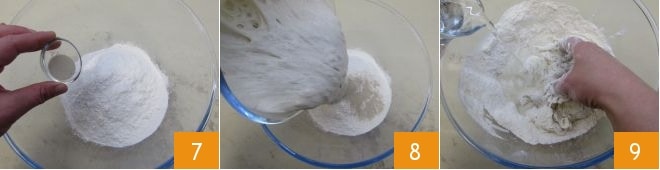 At this point, continue with the dough preparation: in a bowl, sift the all-purpose flour, add the dry yeast 7 and the poolish 8; start kneading by hand, gradually pouring in the water as well 9.