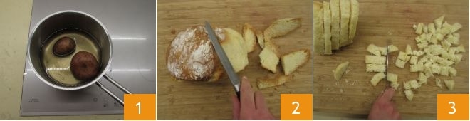 To prepare the beetroot croquettes, the first thing to do is boil the potatoes. It will take about 30 minutes, depending on their size. To check the cooking, you can prick them with the tines of a fork. As soon as they are cooked 1, drain them and let them cool slightly. Remove the crust from the bread 2 to obtain about 370 g (13 oz) of the crumb and cut it into cubes 3.