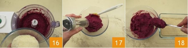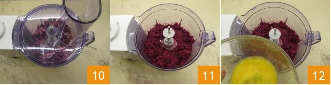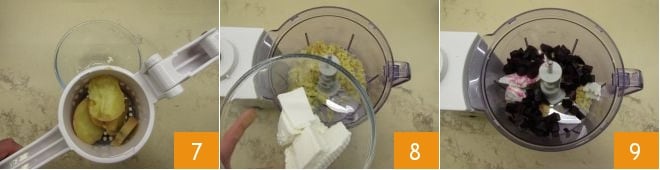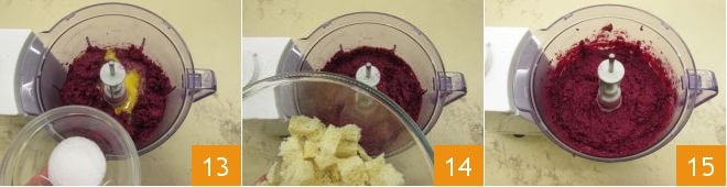 and mash them in another bowl 7. Then transfer them to a blender together with the ricotta 8 and the beetroot 9.