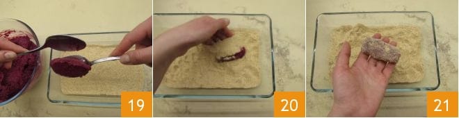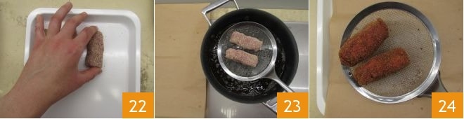 and with the help of another spoon, form a sort of quenelle 19. Then pass it in the breadcrumbs 20 to coat it entirely and slightly press the edges 21.