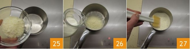 Finish frying the croquettes and in the meantime prepare the accompanying sauce. Pour the Parmesan 25 into a small saucepan, add the cream 26 and mix everything 27.