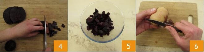 Then cut the beetroot first into slices and then into cubes 4, then set them aside 5. Now peel the potatoes 6.