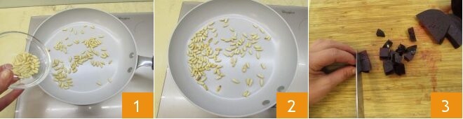 To prepare the beetroot pesto, start by toasting the pine nuts. So, pour them into a pan 1 and continuously toss them over high heat, being careful not to burn them 2; once golden, set them aside. Meanwhile, cut the beetroots into chunks 3,