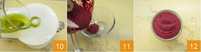 Close the food processor and activate the blades, pouring the oil gradually 10, blend until you obtain a smooth and homogeneous cream 11. Transfer into a bowl, and here's your beetroot pesto 12, ready to be used as a pasta dressing or served on fragrant crostini!