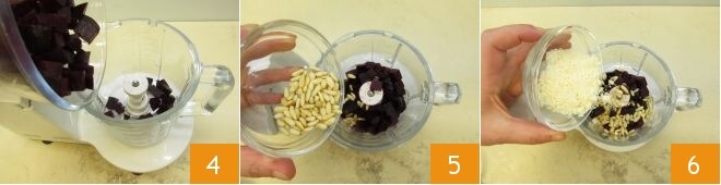 and also add the beetroot to the blender 4 together with the pine nuts 5. Also add the grated Parmesan cheese 6,