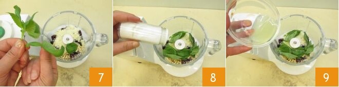 the basil leaves 7, a pinch of salt 8, and the juice of half a lemon 9.
