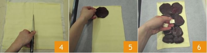 Now take the puff pastry roll, unroll it, and cut it in half lengthwise 4, then transfer one of the halves onto a baking sheet lined with parchment paper and preheat the oven to 356°F in static mode. Cover the surface of the puff pastry with the beetroot slices, being careful to leave the space around the edges free 5, then distribute the gorgonzola pieces evenly 6,