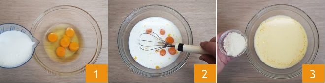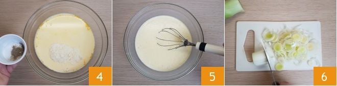 Add a pinch of salt and a sprinkle of pepper 4. Mix everything with a hand whisk 5 and set aside. Take the leek, remove the green part. Cut it lengthwise and remove the tougher outer part. Slice the leek into fairly thin rings 6; you will need 2 oz.
