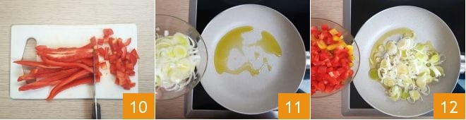 Do the same with the red bell pepper 10; you will also need 3 oz of it. Heat a drizzle of oil in a non-stick pan, add the leek 11 and the bell pepper cubes 12.