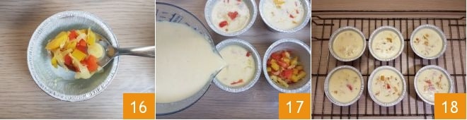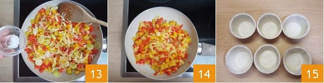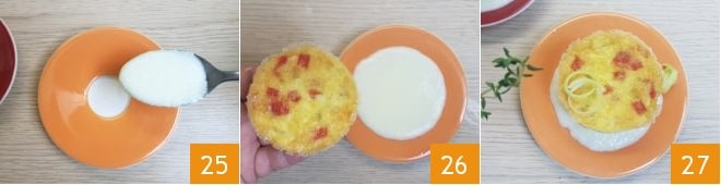 Evenly distribute the bell peppers and leeks at the bottom of the molds. You will need about 2 tablespoons per serving 16. Pour the egg mixture inside until filling ¾ of the molds 17. Place the molds on an oven rack 18 and bake in a preheated static oven at 356°F for 25 minutes.