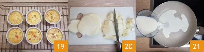 Once ready, remove them from the oven 19 and let them cool for 10 minutes before removing them from the mold. Meanwhile, prepare the cheese sauce: dice the provolone 20, heat the milk in a saucepan 21.