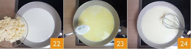 and add the diced provolone 22. When the cheese begins to melt, add 1 tablespoon of cornstarch 23 and mix with a hand whisk until you get a smooth and homogeneous sauce 24.