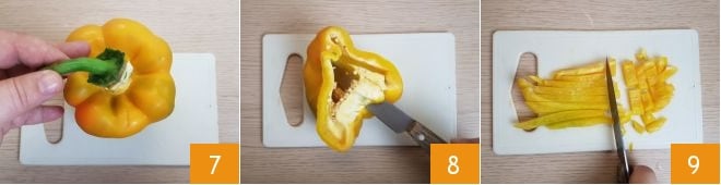 Now wash the yellow bell pepper and remove the stalk 7. Cut it in half and remove the white membranes and seeds 8. Slice the bell pepper into strips and then into fairly small cubes 9; you will need 3 oz.