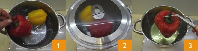 To prepare the bell pepper risotto, start by washing the bell peppers, then place them in a pot full of water 1 and bring to a boil for 15 minutes, covering with a lid 2 and turning them occasionally. After 15 minutes, remove the bell peppers from the boiling water (keep the water you cooked them in) using kitchen tongs, being careful to retain the cooking water 3