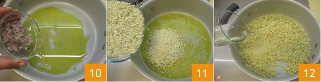 In a large saucepan, heat the olive oil, add the chopped shallot 10, and let it wilt for about 7-8 minutes over low heat, stirring often to prevent the shallot from burning. Add the rice 11 and toast it for 5 minutes. Then deglaze with the white wine 12 and let it evaporate.
