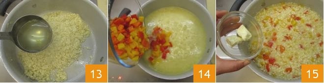 Cook the rice by gradually adding the vegetable cooking broth 13, making sure to let the liquid be absorbed before adding more, stirring the rice often to prevent it from sticking. The risotto will take about 15-18 minutes to cook (for safety, we recommend tasting to see if it needs to cook longer); 10 minutes before the end of cooking, add the bell peppers and continue cooking the risotto 14. Finally, finish cooking the rice and at the end season with salt and pepper; then stir in the butter 15
