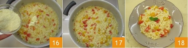 also add the grated cheese 16. Stir to incorporate the ingredients well: you will obtain a creamy, delicate, and at the same time flavorful risotto. Your bell pepper risotto is ready 17, serve it hot, garnishing the plate with fresh mint leaves 18!