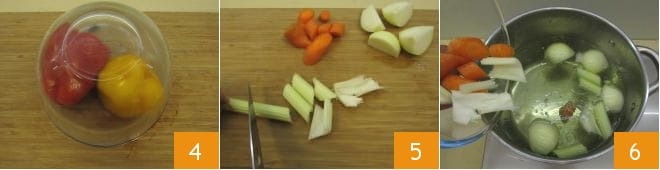 Place the bell peppers on a cutting board and cover them with a glass bowl 4, alternatively, you can put the bell peppers in a bowl covered with plastic wrap. This way, it will be easier to remove the outer skin. Now prepare the vegetable broth: wash the carrot, celery, and peel the onion, cut the vegetables into coarse pieces 5 and pour them into the reserved cooking water of the bell peppers 6 and bring to a boil, cooking for 30 minutes.