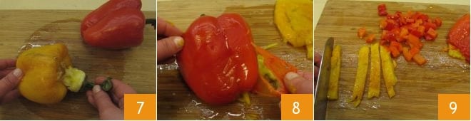 Now take the hot bell peppers, cut the top with a knife to remove the stem 7 then peel off the outer skin 8, cut them in half to remove the seeds inside, and cut them first into strips 9 and then into cubes.