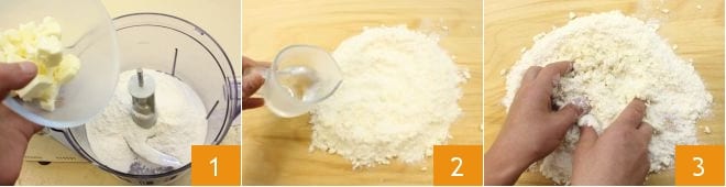 To make the berry flan with chocolate sauce, start by preparing the shortcrust pastry: put the flour, cold butter pieces from the fridge 1, a pinch of salt in the blender and blend everything until you get a sandy and flour-like consistency. At this point, place the mixture on a surface in the classic fountain shape, gradually add cold water 2 and knead quickly 3 until you obtain a compact, firm, and fairly elastic dough.
