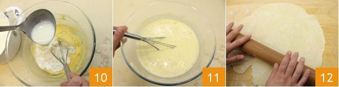 beat the mixture with the whisks, then add the seeds of the vanilla pod 9 and gradually pour in the two previously heated milks 10, always stirring until you get a fairly liquid, smooth, and lump-free mixture 11. Take the shortcrust pastry, roll it out into a round sheet about 1/16 inch thick on a lightly floured surface 12,