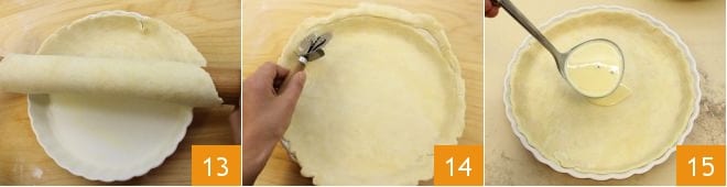 wrap the pastry around the rolling pin and then unroll it onto a baking pan with fluted edges and a diameter of 11 inches, previously buttered and floured 13. Trim the excess edge with a serrated pastry cutter 14 and pour the condensed milk cream into the cake 15,