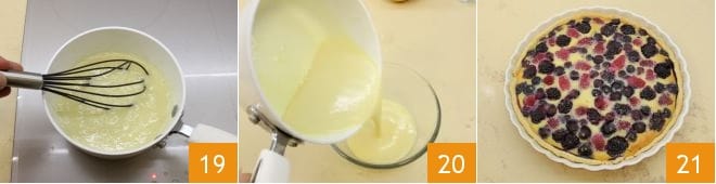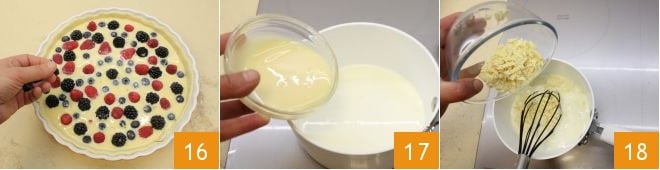 distribute the berries all over the surface 16 and bake in a static oven at 392°F for 35 minutes (or in a fan oven at 356°F for 25 minutes). In the meantime, prepare the accompanying sauce: chop the white chocolate, then pour the fresh cream and condensed milk into a saucepan 17, heat the mixture and then incorporate the chopped chocolate 18