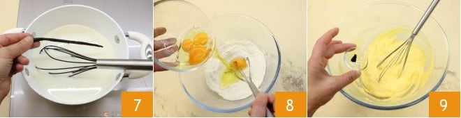 and the vanilla pod 7, heat over low flame for 5 minutes to dissolve the sugar, then in a separate bowl place the sifted flour, add the eggs 8