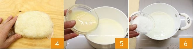 Once ready, wrap your shortcrust pastry in a sheet of plastic wrap 4 and let it rest in the fridge for at least 40 minutes. In a saucepan pour the fresh milk, the condensed milk 5, the sugar 6