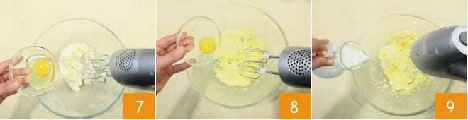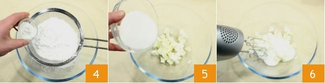 the all-purpose flour and the baking powder 4 and set the powders aside. In another bowl, place the room temperature butter cut into cubes, add the granulated sugar 5, and beat the mixture with electric whisks 6 to obtain a cream.