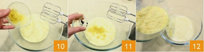 When the ingredients are well mixed, turn off the whisks and flavor the batter with the lemon zest 10 and the vanilla bean seeds 11. Now incorporate the egg mixture into the powders 12