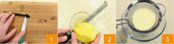To make the Bertolda cake, start with the aromas: slice the vanilla bean in half lengthwise and scrape out the seeds with a knife 1. Grate the zest of an untreated lemon and collect it in a small bowl 2. Now sift the corn 'fumetto' 3,