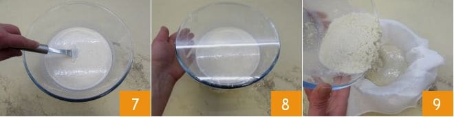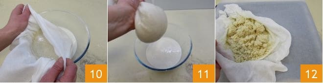 then squeeze the cloth well to extract all the liquid and collect it in the bowl (10-11). Place the chopped and softened almonds contained in the cloth on a baking sheet lined with parchment paper 12,